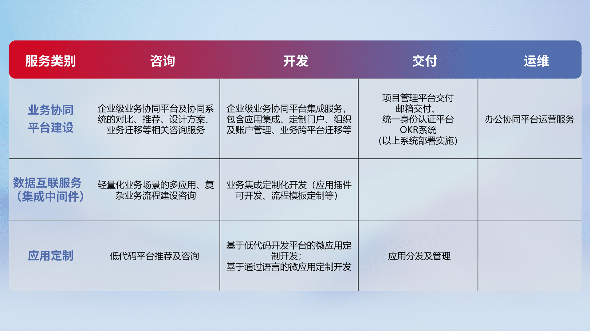 针对钉钉、、、企微、、、、IDaas等平台级产品提供产品的规划、、方案、、、、交付、、定制化开发等服务,,,实现如统一协同办公、、智能客户服务、、、、混合会议管理、、、、智能数据查询、、等业务场景,,,实现数字化转型。。